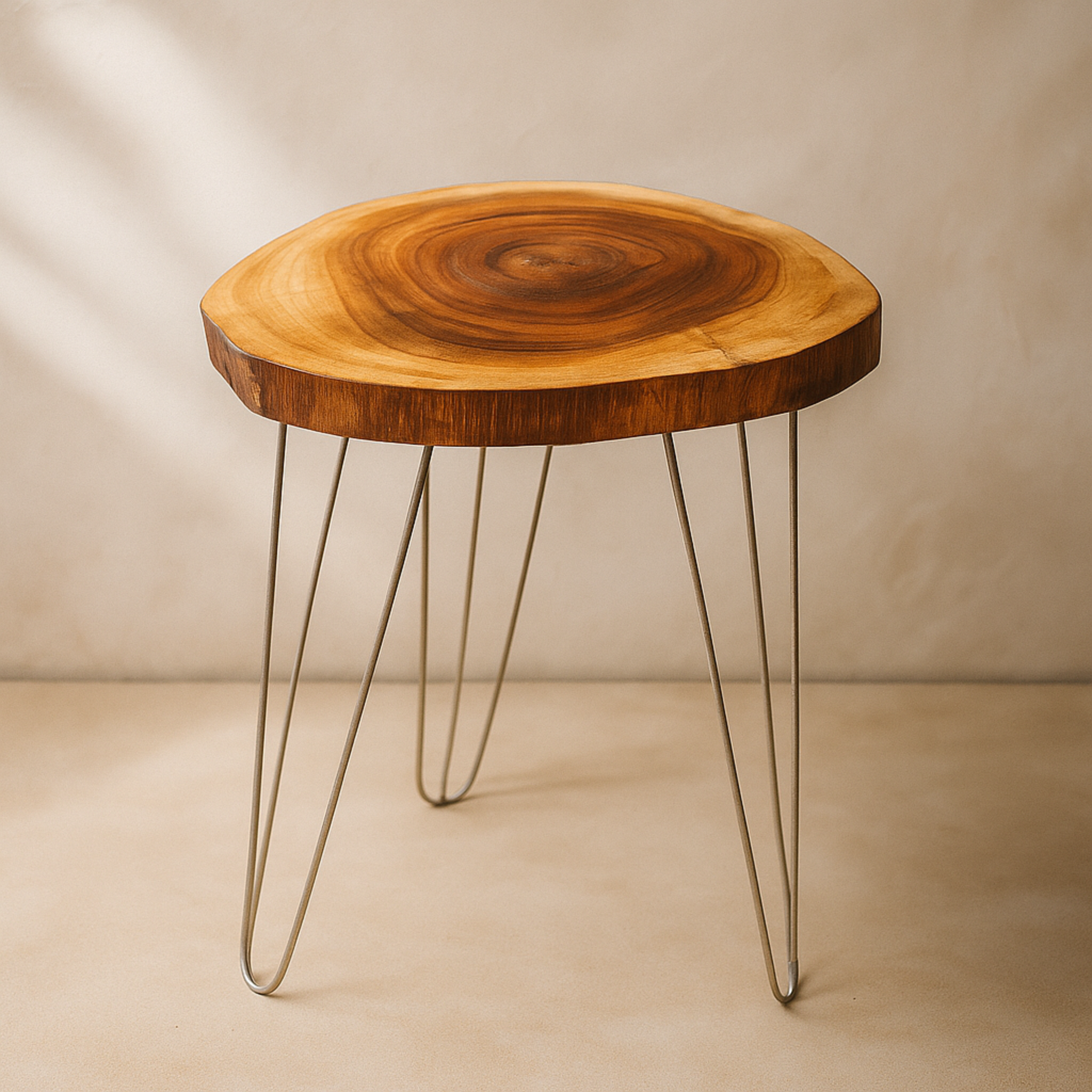 Bring nature’s timeless beauty into your home with our Handcrafted Natural Wood Side Table, designed with a perfect balance of rustic charm and modern minimalism. Each table is made from a solid slice of natural wood, featuring unique grain patterns and organic shapes that make every piece truly one of a kind. Supported by sleek metal hairpin legs, this table effortlessly complements any interior — from contemporary lofts to cozy farmhouse spaces.