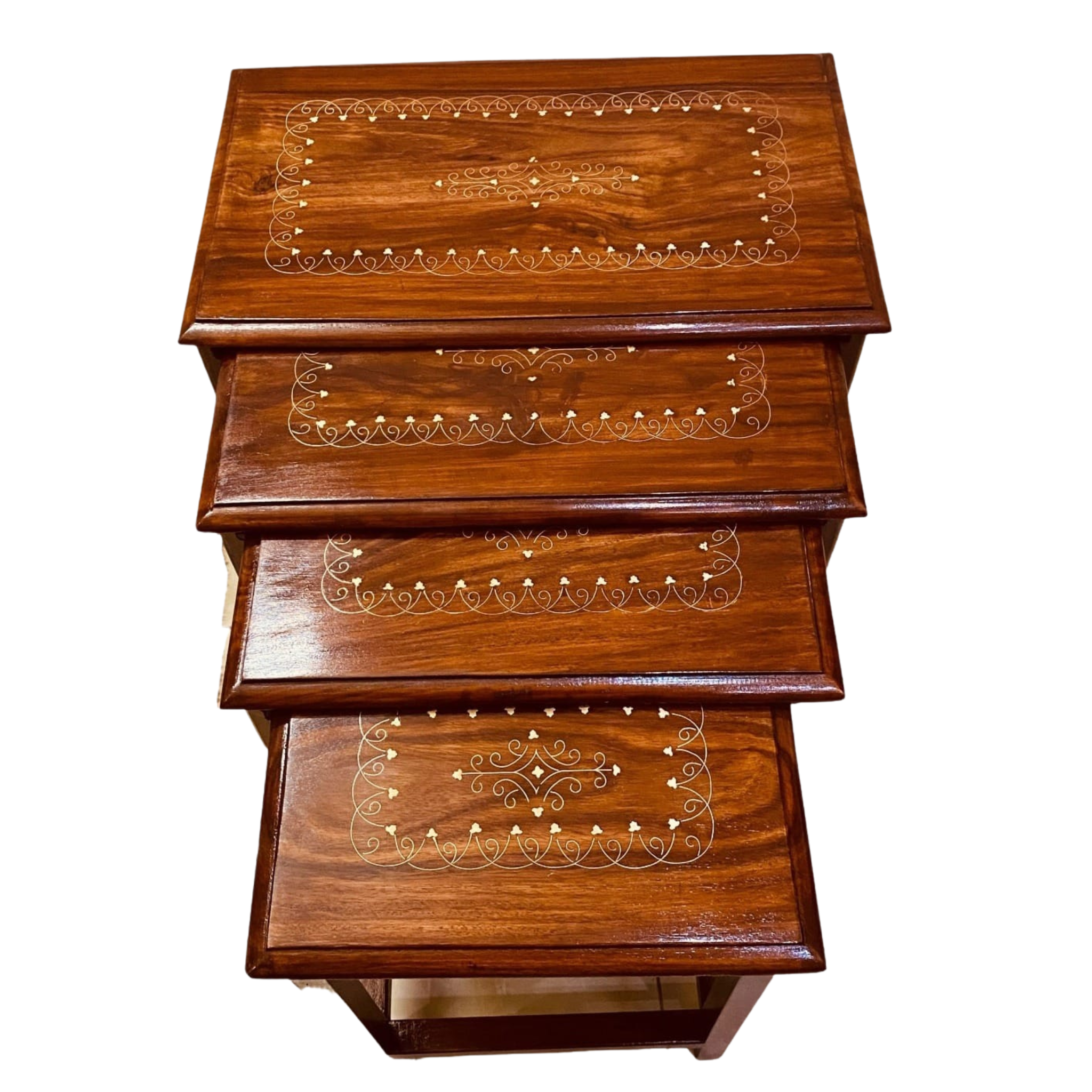 Each table is beautifully hand-polished to a rich, warm finish, showcasing the natural grain of Sheesham wood. The tops feature intricate hand-carved detailing and delicate inlay patterns, reflecting the artistry of skilled craftsmen. Whether you use them together or individually around your home, these nesting tables effortlessly combine elegance, durability, and everyday convenience.